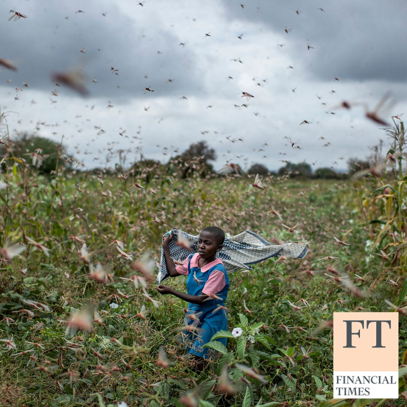 FILE – A farmer's daughter waves her shawl in the air to try to chase away swarms of desert locusts from her crops, in Katitika village, Kitui county, Kenya Friday, Jan. 24, 2020. (Ben Curtis / AP)