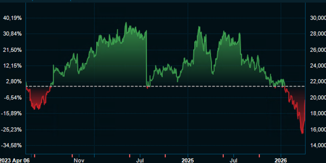 UMG:s aktieutveckling i Amsterdam de senaste tre åren. (Skärmdump Infront, 8 april 2026.)