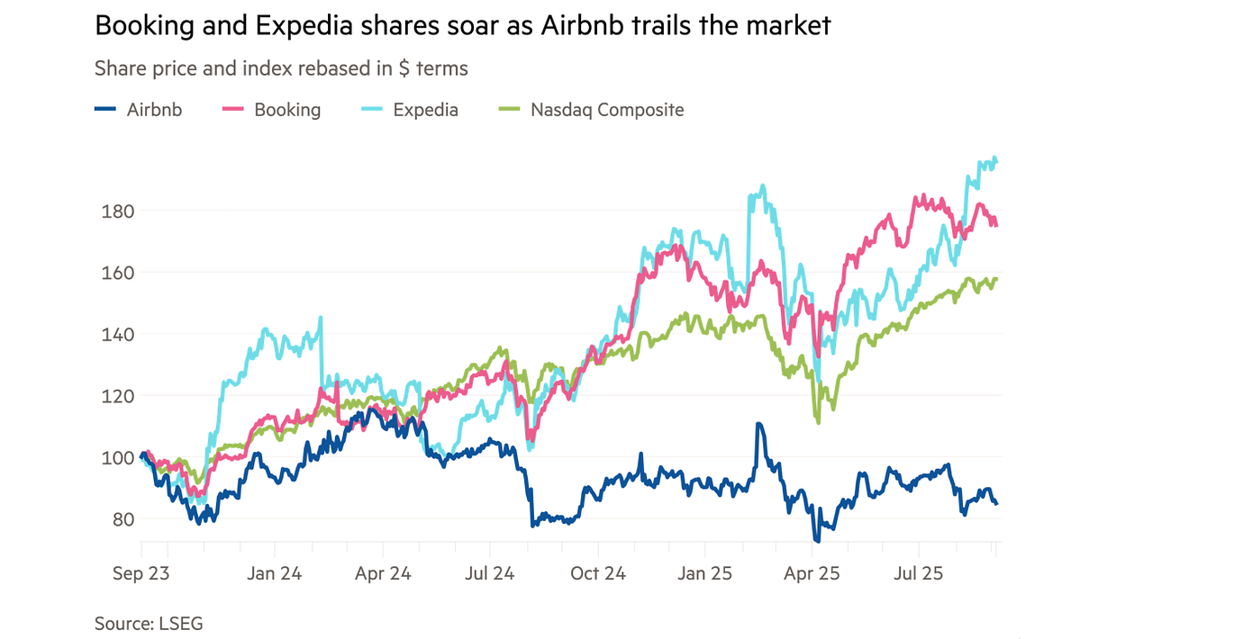 Booking and Expedia have tracked closely with the performance of the tech-heavy Nasdaq Composite this year, but have not posted the same astronomic performance seen elsewhere in the wider tech market. Airbnb shares are down nearly 6 per cent this year.