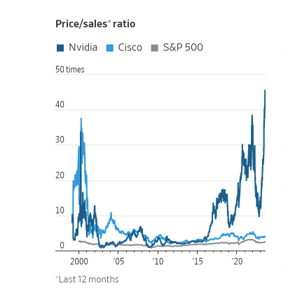 Investors are paying up for the shares, betting on a windfall down the line. Nvidia is trading at 41 times its sales from the last 12 months, according to FactSet, compared with 2.4 times sales for the S&P 500. On a forward basis, the stock trades at 20 times its expected sales for the year ahead—double its average over the last decade of 10 times, according to Dow Jones Market Data.