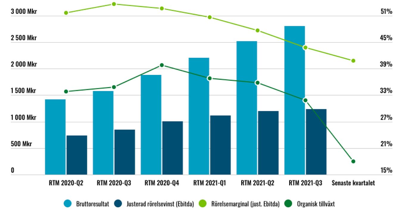 Aktien rasade hela 20% på Q3-rapporten. Det hänger troligen ihop med att det inte finns någon snabb (organisk) comeback på radarn, vare sig för lönsamhet eller tillväxt. Tvärtom ser innevarande kvartal ut att bli väldigt svagt med en tuff jämförelsesiffra (+43% tillväxt Q4 2020) och konsolidering av förvärv med låg tillväxt i de organiska siffrorna.