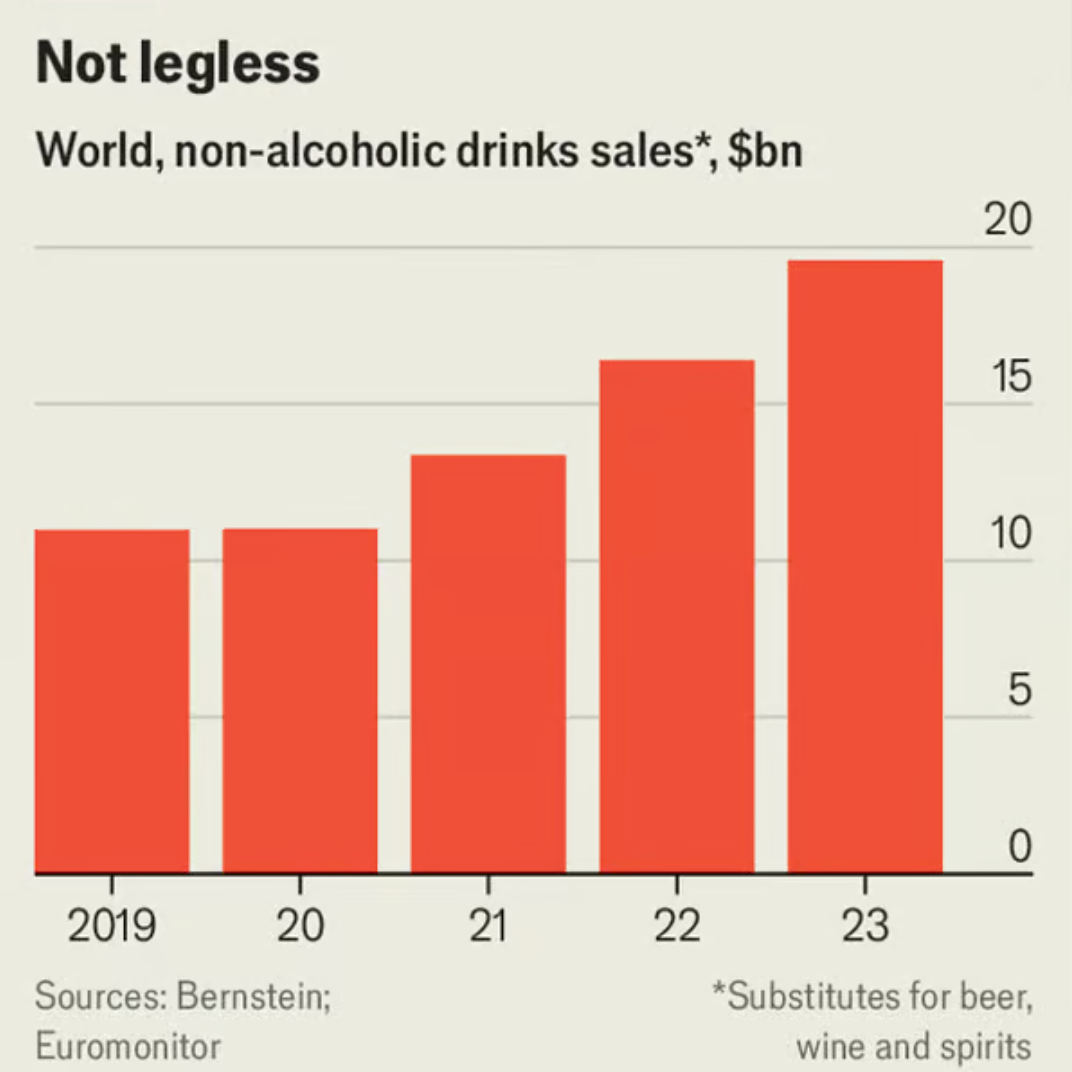 The teetotal and “sober curious” are no longer restricted to fizzy drinks, fruit juice or plain old water. The market for non-alcoholic booze—including beer, wine and spirits—has been flying of late. Global sales came to nearly $20bn in 2023, according to the latest data from Euromonitor, a research firm, double the amount of five years before (see chart). The market grew by roughly 20% in 2023, compared with 8% for alcoholic drinks. How big will it get?