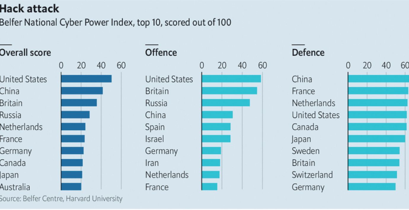 China has the world’s largest army. Russia wields the most tanks. America owns the fanciest satellites. But who has the most cyber-power? A new National Cyber Power Index by the Belfer Centre at Harvard University ranks 30 countries on their level of ambition and capability. Offensive cyber-power—the ability to do harm in or through computer networks—is one measure. But so too are the strength of a country’s defences, the sophistication of its cyber-security industry and its ability to spread and counter propaganda (see chart).