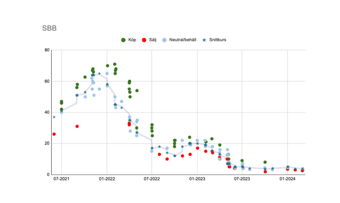 Aktierekommendationer och riktkurser för SBB från de större analyshusen. Datan inhämtad från Direkt och Infront. (Omni Ekonomi)