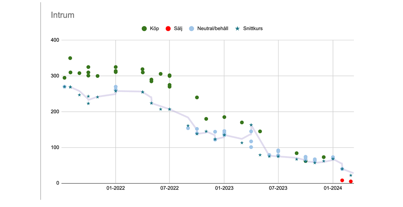 Räntorna ställde till det även för inkassobolaget Intrum, som plötsligt fick det tyngre att vårda sin ökade skuldbörda. Men bolaget var även i färd med att stöpa om sin verksamhet, vilket analytikerna gärna lyfte som positivt. En titt på analyshusens råd för aktien sedan hösten 2021 visar en hel rad köpstämplar – även om riktkurserna även i det här fallet har trimmats i takt med att aktien fallit på börsen.