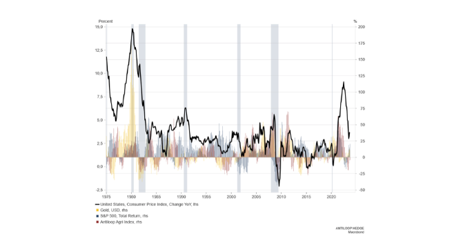 I grafen nedan visas USA:s inflationstakt YoY från år 1975 tillsammans med hur tillgångsklasserna guld, jordbruksråvaror och aktier presterat både under perioder av hög inflation och med låg.