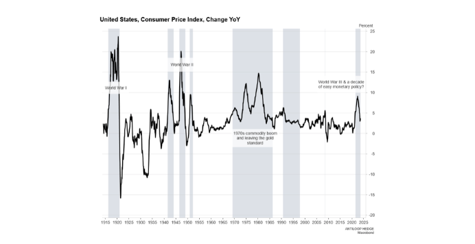Inflationen då? Trots att inflationen både i USA och på många andra ställen kommit ner till lägre nivåer är det inte ett kvitto på att problemet är löst för de kommande åren. Om vi ser till historien även där kan vi konstatera att inte under ett enda tillfälle då inflationen har passerat 5 procent har vi endast sett en topp.