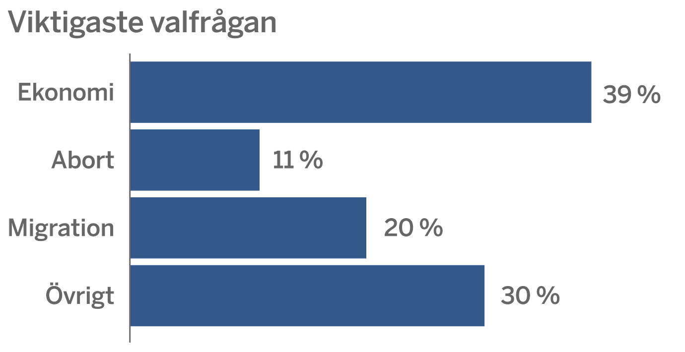 CNN:s vallokalsundersökning visar på liknande tendenser. Där är de tre viktigaste frågorna demokratin (35 procent), ekonomin (31 procent) och abortfrågan (14).