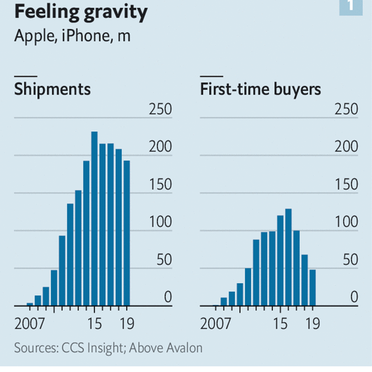 Mr Cook and Sundar Pichai, who runs Google’s corporate parent, Alphabet, may beg to differ—not least because each can claim to have to compete with the other. Either way, Apple may be tempted to carry on squeezing its developers even as regulatory storm clouds gather. Smartphones, which have powered the firm’s transformation from also-ran to colossus over the past decade, have become a mature market. Sales of iPhones are stagnant. Those who already own a device replace it less frequently. And the number of people buying an iPhone for the first time has fallen by 63% from its peak in 2016, calculates Neil Cybart of Above Avalon, a tech-analysis firm.