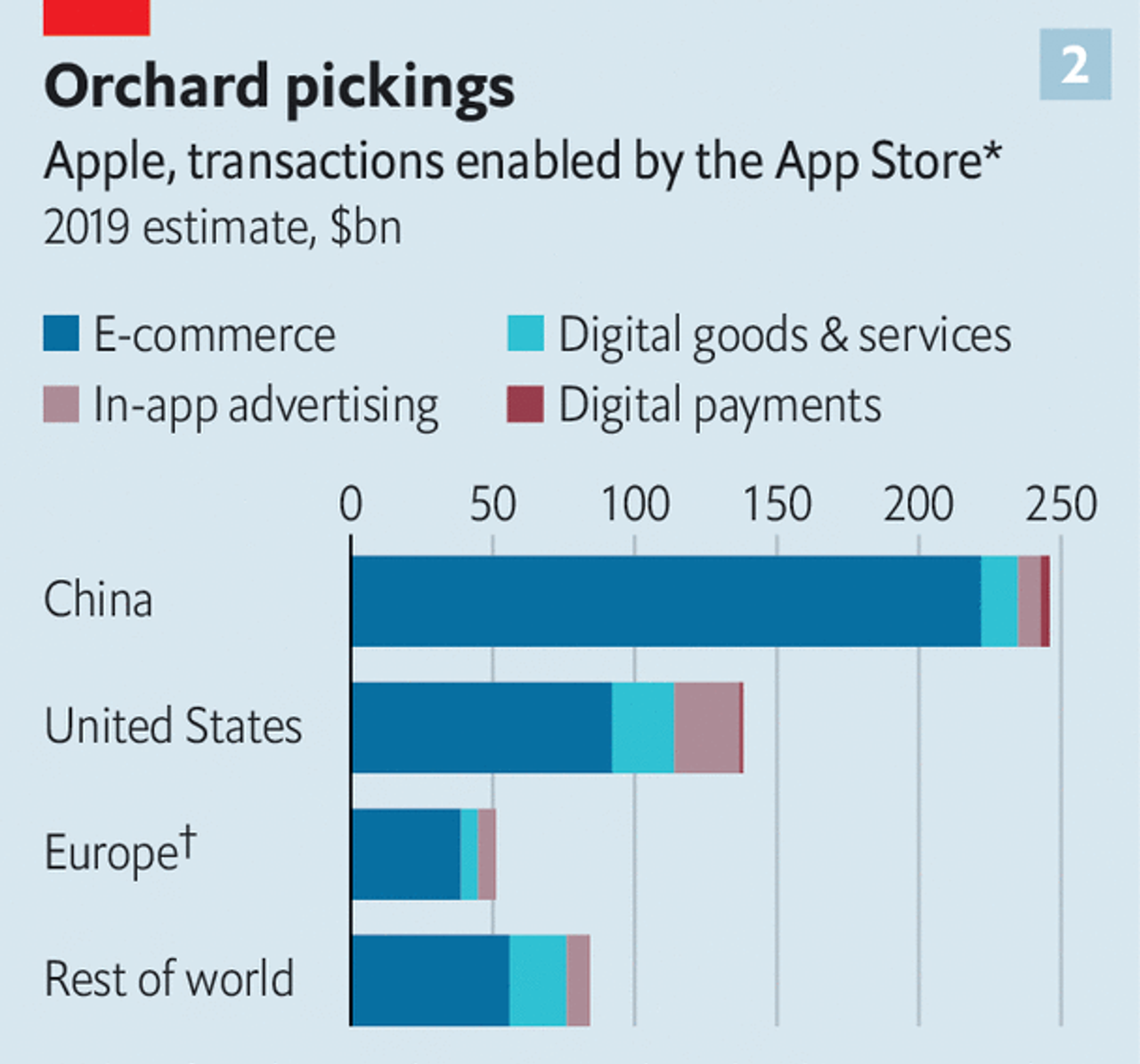 Apple plans to replace revenue from selling phones with that from services. This includes proceeds from, among others, warranties and video-streaming, as well as App Store fees and commissions. A new study, financed by Apple, estimates the size of the global market for everything that the App Store has created, from food-delivery to online shopping, at $519bn a year (see chart 2). One way to read this is as an advertisement for Apple’s benevolence. Advertising and digital goods, from which the firm takes a cut, make up just a fifth of the total. On the other hand, the study also highlights just how much more digital terrain remains to be harvested.