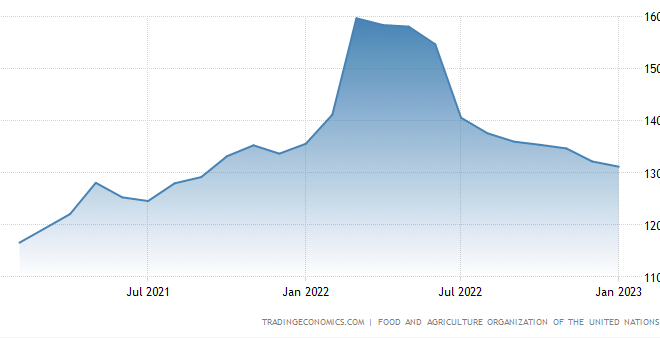 Priset på mat skenade under förra våren när flödet av framförallt spannmål och vegetabiliska oljor från landet som kallats Europas kornbod till världsmarknaden stoppades av det ryska angreppet. Vid slutet av året hade FN:s breda matprisindex fallit tillbaka kraftigt under hösten men det ligger fortfarande högt över sitt historiska genomsnitt.