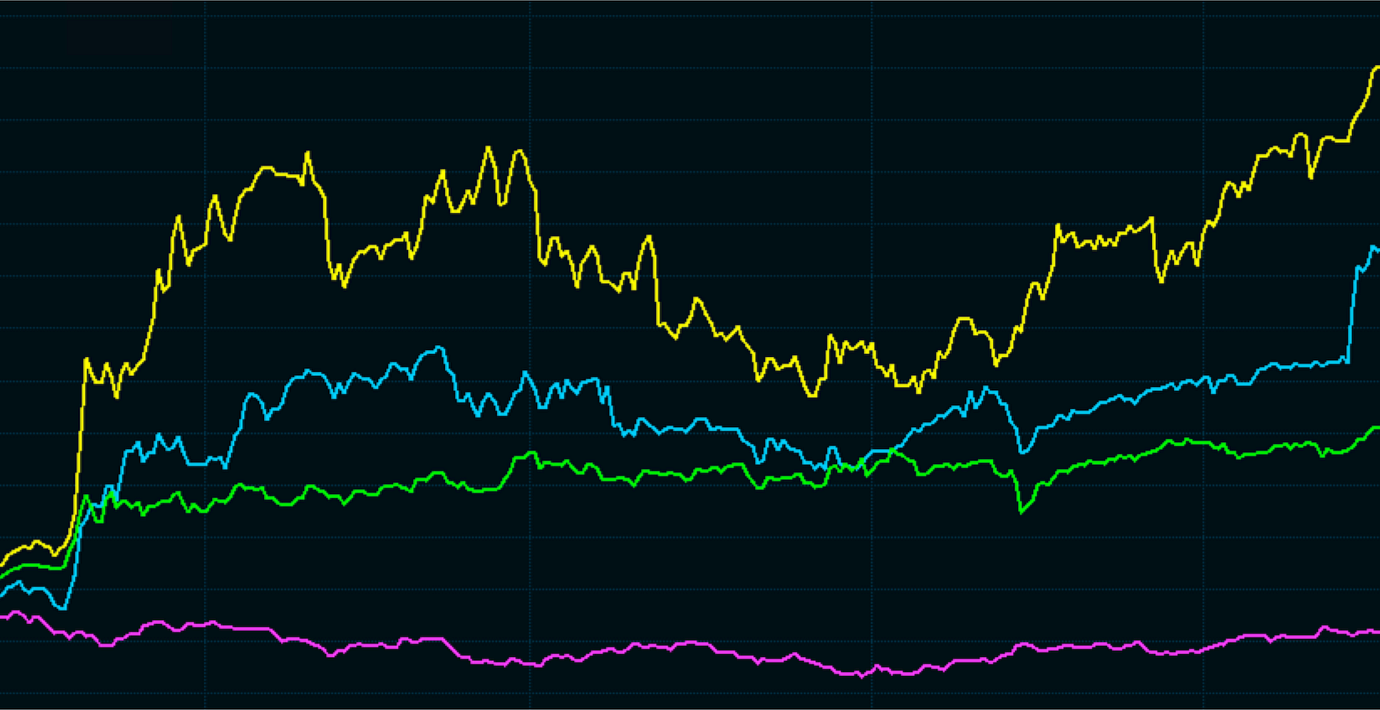 Bland de fåtalet aktier som gynnats av invasionen finns försvarssektorn, i spåren av ökade försvarsanslag. I grafen ovan syns utvecklingen för svenska Saab (blått), brittiska BAE Systems (grönt) och tyska Rheinmetall (gult) jämfört med Stockholmsbörsen (lila).