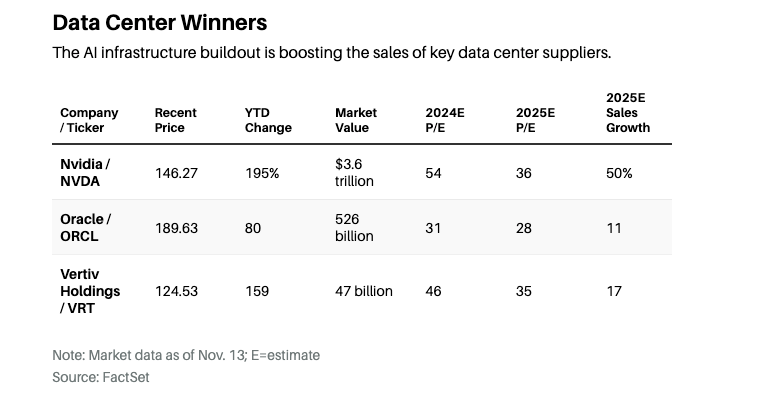 To be sure, AI’s early profits won’t be evenly spread around the market. The arms dealers in the AI race remain the best way to play the opportunity, with three stocks particularly well positioned: Nvidia, cooling specialist Vertiv , and cloud provider Oracle .