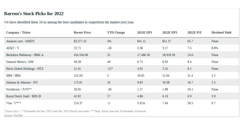 Here are Barron’s 10 stock picks for 2022, in alphabetical order: