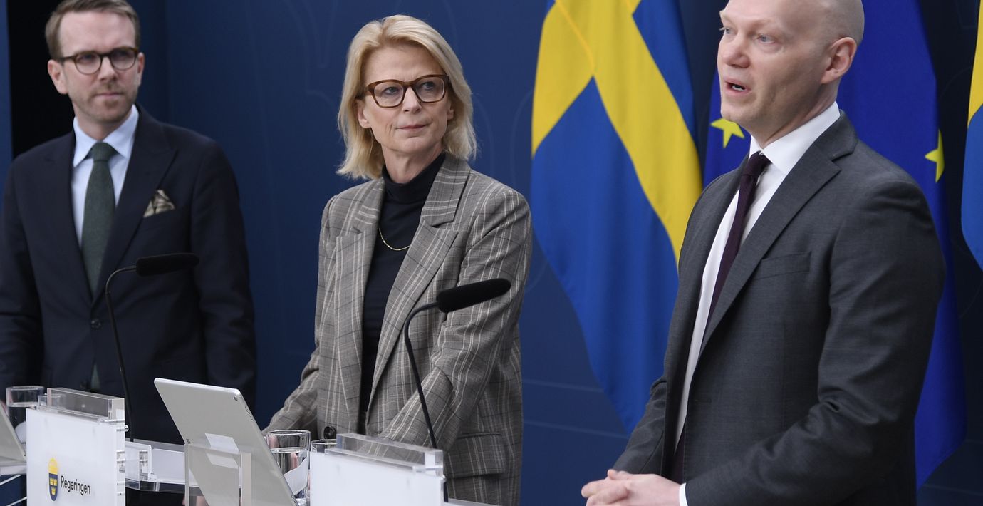 Finansminister Elisabeth Svantesson (M), finansmarknadsminister Niklas Wykman (M) och infrastruktur- och bostadsminister Andreas Carlson (KD) under pressträff om åtgärder för att minska överskuldsättningen, den 25 januari 2024. (Fredrik Surell/TT / TT Nyhetsbyrån)