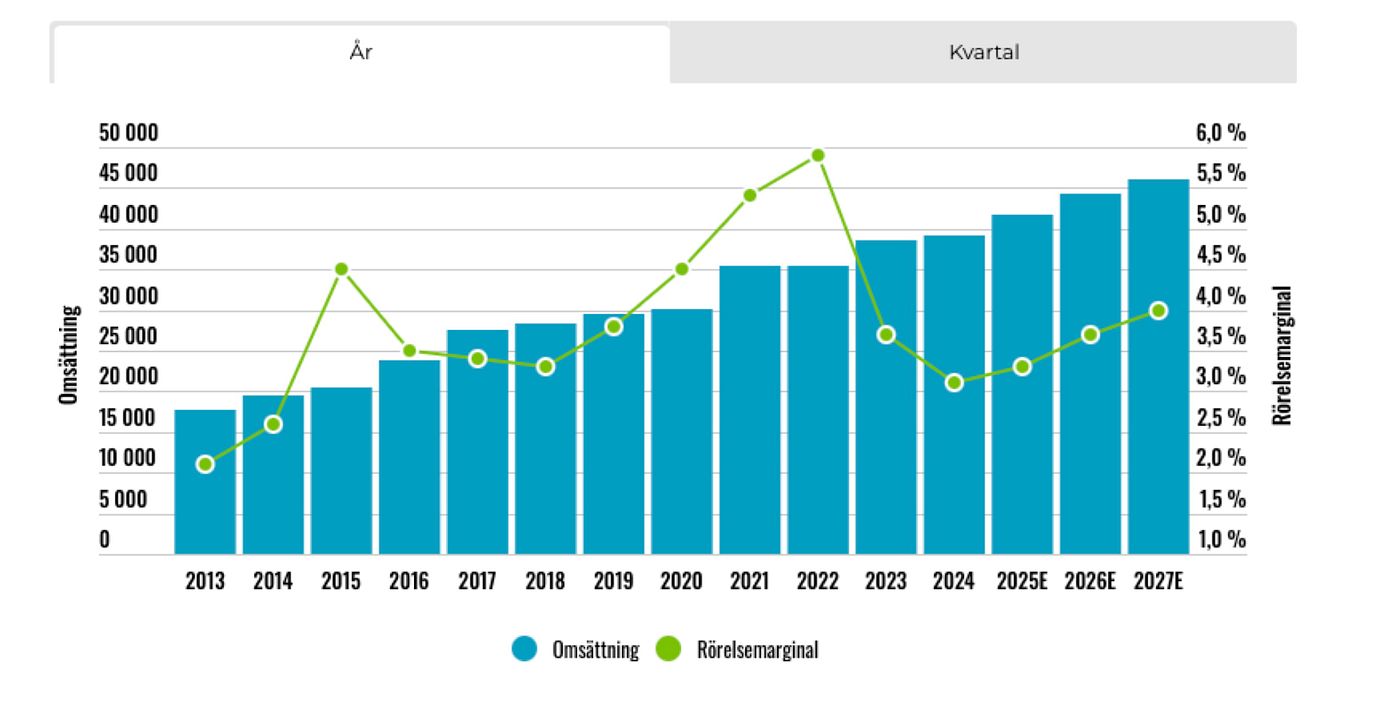 Under första halvåret steg omsättningen knappt 3% till 20,5 Mdkr (19,9). Exklusive förvärv/avyttring och valuta var omsättningen oförändrad. Ebit-marginalen uppgick till 3,0% (3,2).