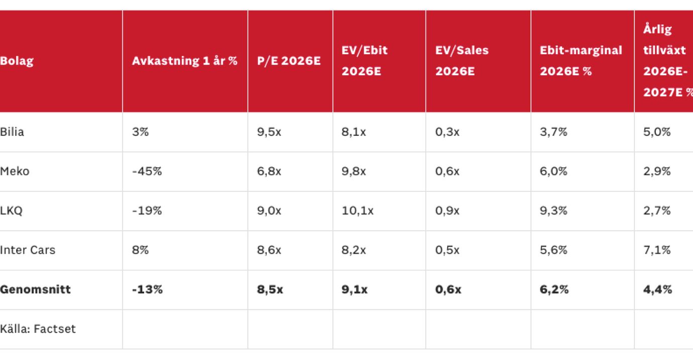 Använder vi en multipel på 9-10 gånger årsvinsten (P/E-tal), i linje med den framåtblickande värderingen senaste tre åren, finns cirka 30% uppsida på sikt. Meko och deras huvudägare i form av amerikanska LKQ värderas kring 7-9 gånger årsvinsten (P/E) samt runt 10x rörelsevinsten på 2026E.