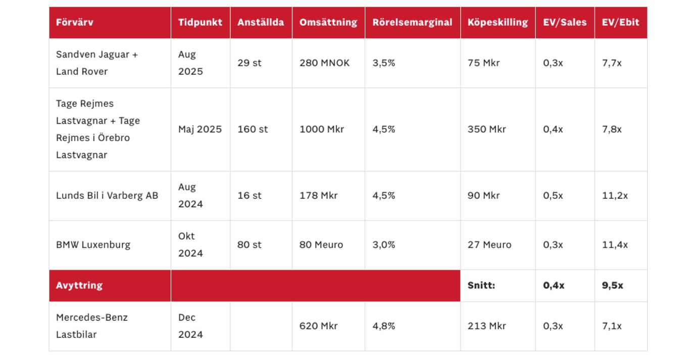 Bilia sålde i december 2024 sin lastbilsverksamhet avseende Mercedes-Benz till finska Veho Oy. Verksamheten drevs på åtta anläggningar och hade under de senaste två åren innan avyttringen haft en omsättning på 620 Mkr i snitt med en rörelsemarginal på 4,8%. Prislappen vid försäljningen landade på 213 Mkr motsvarande 0,3x omsättningen (EV/Sales) och drygt 7x rörelsevinsten. Bilia fortsätter att vara en helhetsleverantör inom Mercedes-Benz personbilar och transportbilar.