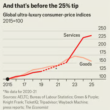 The rich are therefore spending on bigger and better things; things that are often services, rather than goods. We constructed an ultra-luxury-services index, including everything from a ticket to the Super Bowl to eating in a three-Michelin star restaurant. We chose experiences that had both global recognition—these are not just nice, but the best of the best—and where it was possible to unearth reliable price data over many years. The index, according to our calculations, has risen by 90% since 2019. And even as goods prices have fallen since 2023, it has continued to surge (see chart).