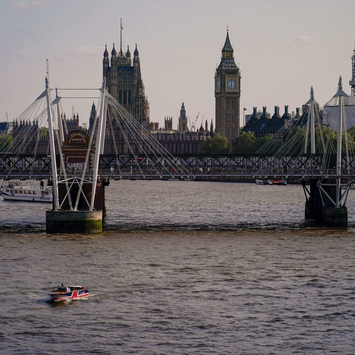 A Union flag themed boat travels along the River Thames, against the backdrop of the Palace of Westminster, in London, Monday, June 5, 2023. (Alberto Pezzali / AP)