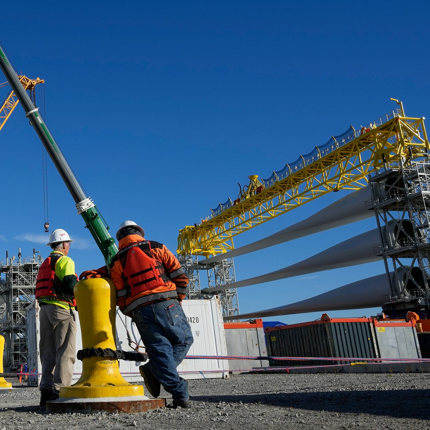 A generator and its blades are prepared to head to the ocean for the South Fork Wind farm from State Pier in New London, Conn., Dec. 4, 2023. (Seth Wenig / AP)