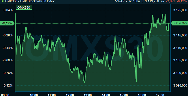 Stockholmsbörsen återhämtade sig något under eftermiddagen i takt med att det amerikanska sentimentet stärktes. Storbolagsindex OMXS30 stängde ned 0,1 procent till nivån 3.120. Lik…