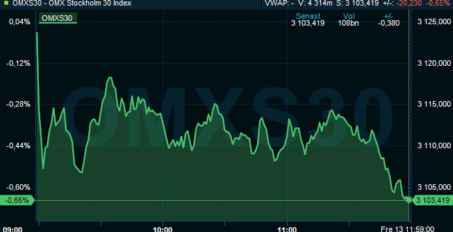 Stockholmsbörsen handlades fortsatt rött på fredagen runt lunchtid.