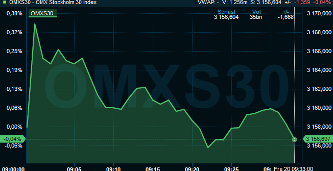 Stockholmsbörsen steg i den inledande handeln på fredagen efter att ha backat under torsdagen. Drygt en halvtimme efter öppning hade den initiala uppgången dock dämpats och storbol…