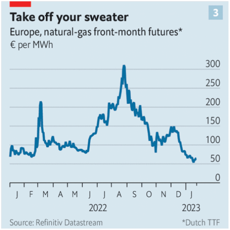 Two factors explain why the global economy is holding up: energy prices and private-sector finances. Last year the cost of fuel in the rich world rose by well over 20%—and by 60% or more in parts of Europe. Economists expected prices to remain high in 2023, crushing energy-intensive sectors such as heavy industry. On both counts they were wrong. Helped by unseasonably warm weather, companies have proven unexpectedly flexible when it comes to dealing with high costs. In November German industrial gas consumption was 27% lower than normal, yet industrial production was only 0.5% down on the year before. And over the Christmas period European natural-gas prices have fallen by half to levels last seen before Russia invaded Ukraine.