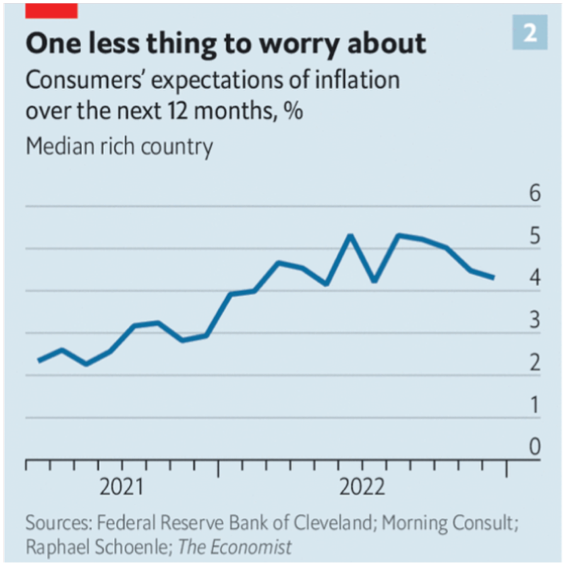 Investors pay attention to labour markets, but what they really care about right now is inflation. It is too soon to know if the threat has passed. In the rich world “core” inflation, a measure of underlying pressure, is still 5-6% year on year, far higher than central banks would like. The problem, though, is no longer getting worse. In America core inflation is dropping, as is the share of small firms which plan to raise prices. Another data set, from researchers at the Federal Reserve Bank of Cleveland, Morning Consult, a data firm, and Raphael Schoenle of Brandeis University, is a cross-country gauge of public inflation expectations. It also seems to be falling.