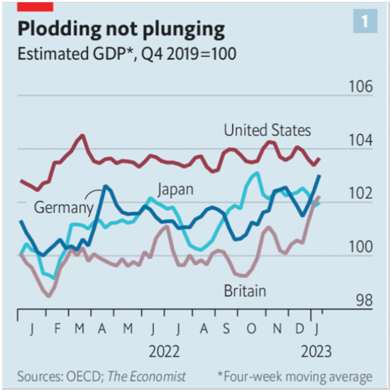 Forecasters are in part responding to real-time economic data. Despite talk of a global recession since at least last February, when Russia invaded Ukraine, these data have held up better than expected. Consider a weekly estimate of gdp from the oecd, a group of mostly rich countries which account for about 60% of global output. It is hardly booming, but in mid-January few countries were struggling. Widely watched “purchasing-manager index” measures of global output rose slightly in January, consistent with gdp growth of about 2%.