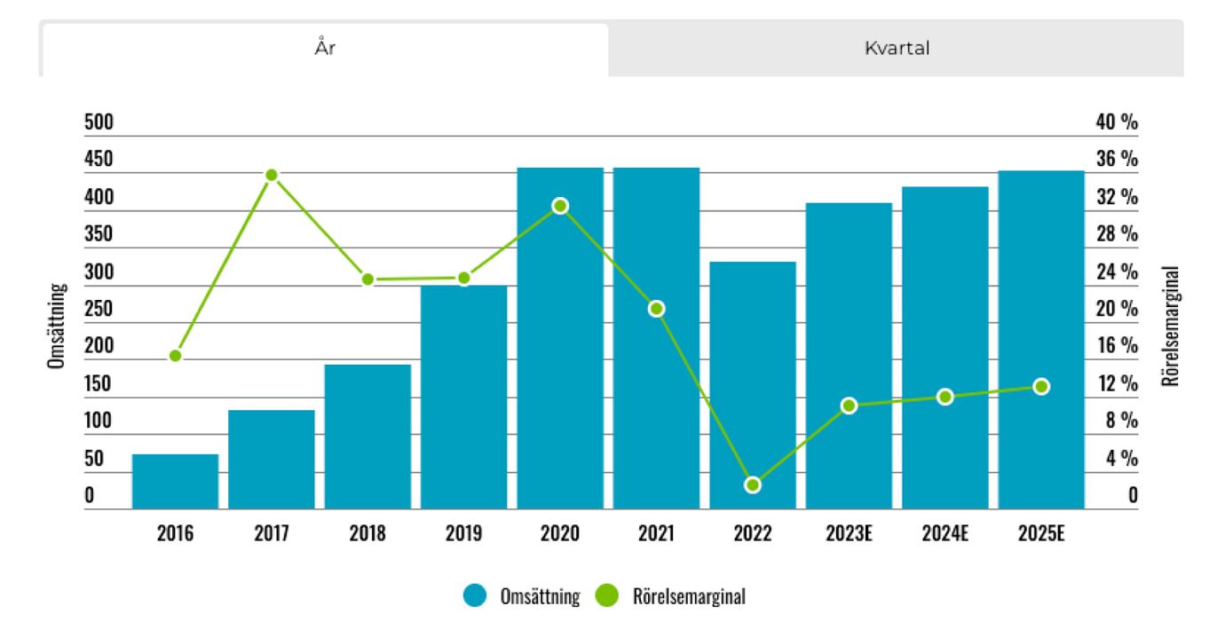 2021 var intäkterna oförändrade på helårsbasis medan rörelsemarginalen föll till 21,4% (32,5). Intäktstappet fortsatte under 2022 och omsättningen minskade med 28%. Ebit-marginalen pressades till 2,47%.