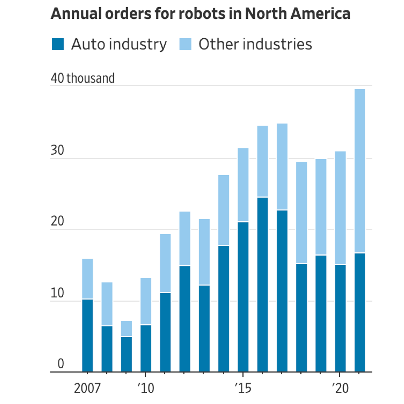 The use of industrial robots in North America for years had been concentrated in the automotive industry, where robots took on repetitive tasks such as welding on assembly lines. While auto makers and manufacturers of auto components accounted for 71% of robot orders in 2016, their share declined to 42% in 2021, the automation association said. Meanwhile, robots made inroads into other sectors including food production, consumer products and pharmaceuticals. Executives said improved capabilities are allowing robots to be programmed for more-complex tasks requiring a mixture of strength and nimbleness.