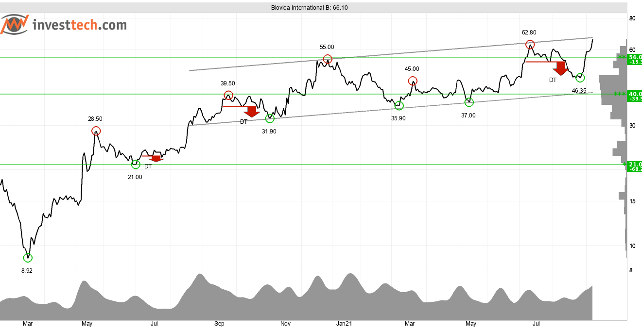 Läkemedelsbolaget Biovica International noterade nytt all-time-high i tisdags. Detta har förgåtts av en stark kursutveckling senaste veckan, i kombination med en ordentligt ökande handelsvolym (grå grafen längst ned i figuren). Brott genom motstånden vid 56-63 kronor har gett köpsignal. Den positiva volymutvecklingen har resulterat i en stark volymbalans, och med det en indikation på aggressiva köpare som pressar på och vill in i aktien. Detta ger en stärkt köpsignal och öppnar för statistiskt goda möjligheter till fortsatt uppgång.