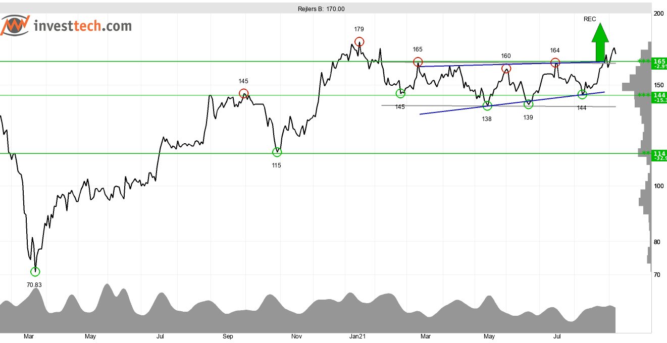 Rejlers som erbjuder tekniska konsulttjänster inom bland annat energi, bygg, och fastighet, har fått en serie positiva tekniska signaler efter att motståndet vid 165 kronor brutits. Denna nivå har utgjort taket i den horisontella trend aktien rört sig i under större delen av året. Golvet finns intill 140 kronor och sammanfaller i stort med stödet vid 144 kronor. Brottet genom motståndet har utlöst köpsignal i aktien. En positiv volymutveckling indikerar gott köptryck i aktien när kursen stiger, vilket i sin tur stärker köpsignalen. Aktien stärks vidare av avsaknaden av motstånd ovanför dagens kurs. Investtechs forskning visar att aktien sammantaget har statistiskt goda förutsättningar till fortsatt god utveckling framöver. Särskilt brottet ur den horisontella trenden har visat sig medföra särskilt gynnsamma förutsättningar till god utveckling och meravkastning mot referensindex.