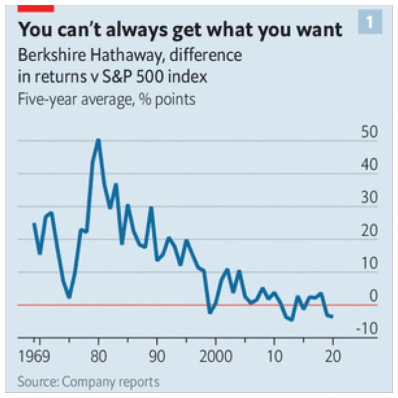Start with the financial performance. Operating profit — the number Mr Buffett urges shareholders to focus on — fell by 9% in 2020, to $22bn, after a flat 2019 (though it rebounded in the latest quarter, up 20% year on year). Berkshire’s shares badly underperformed the S&P 500 index in both years. Over the past ten years, its per-share market value has handily beaten the index just twice, while lagging far behind it four times. In truth, Berkshire’s performance relative to the S&P has been slipping for decades.