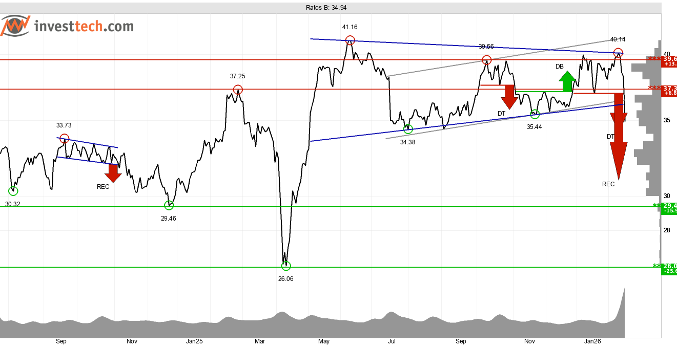 Aktiekursen har brutit den stigande trendkanalen på medellång sikt, vilket i första skedet indikerar svagare stigningstakt. Samtidigt bröts stödnivån vid 37,30 kronor och fallet utlöste även två säljsignaler från kursformationer. En från en dubbeltopp (DT) och en från en rektangelformation (REC) där fortsatt nedgång signaleras. Stöd återfinns vid cirka 29,40 kronor (33,00 kronor på lång sikt) och motstånd vid cirka 37,30 kronor.