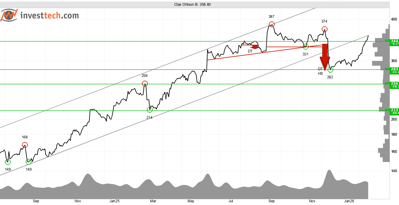Nyligen bröt aktiekursen även upp genom motståndet vid cirka 344 kronor som därmed ombildades till en ny stödnivå. En starkt positiv volymbalans visar att volymen har varit högre på uppgångsdagar än på nedgångsdagar. Även det indikerar att optimismen är ökande hos investerare och bekräftar den positiva trendbilden. Aktien uppvisar även ett starkt positivt momentum och signalerar därmed fortsatt uppsida.