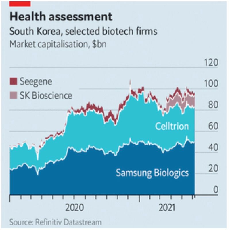 I Sydkorea tvingades många bolag inom bioteknik ställa om förra året. Flera bolag jobbade dygnet runt när pandemin slog till. De anställde, riktade alla resurser mot problemet och tog fram testkit, vaccin och behandlingar för covid-19. Utvecklingen har gjort att fem av de tio högst värderade bolagen i Kosdaq-indexet nu finns inom bioteknik, jämfört med två år 2019. Bolagen utvecklades mer på ett år än under det tidigare decenniet, säger branschföreträdare till The Economist.