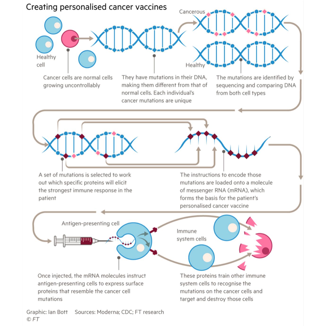 David Braun, an oncologist focusing on kidney cancer at the Dana-Farber Cancer Institute in Boston, says it is a long road from Covid vaccine to personalised cancer jab. “Medicine has made this mistake many times in the past, going from enthusiasm and great ideas to overpromising,” he says. “There’s a lot of promise for mRNA to be used beyond infectious disease but it’s a big leap.”