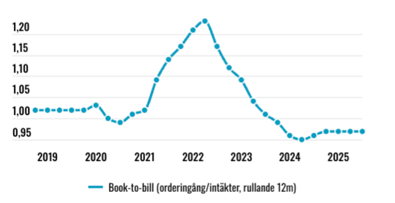 Illa är också att den mer framåtblickande orderingången var svag, -4% för koncernen i tredje kvartalet. Organiskt var tillväxten 0% men det motverkades av valutamotvind på -6%. Förvärv bidrog med 2%. Många kunder är fortsatt försiktiga och vågar inte fatta större investeringsbeslut.