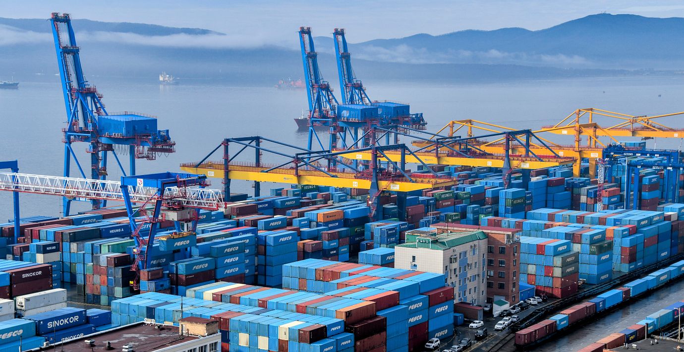 Ryssland är ett av länderna som undantas från Trumps tullsmocka. Bilden visar hamnen i Vladivostok. (AP)