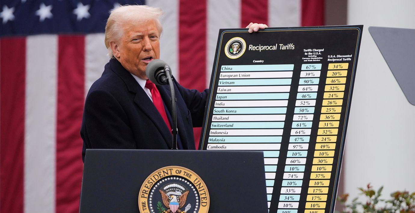 Donald Trump presenterar breda tullar på en presskonferens utanför Vita huset den 2 april 2025. (Mark Schiefelbein / AP)