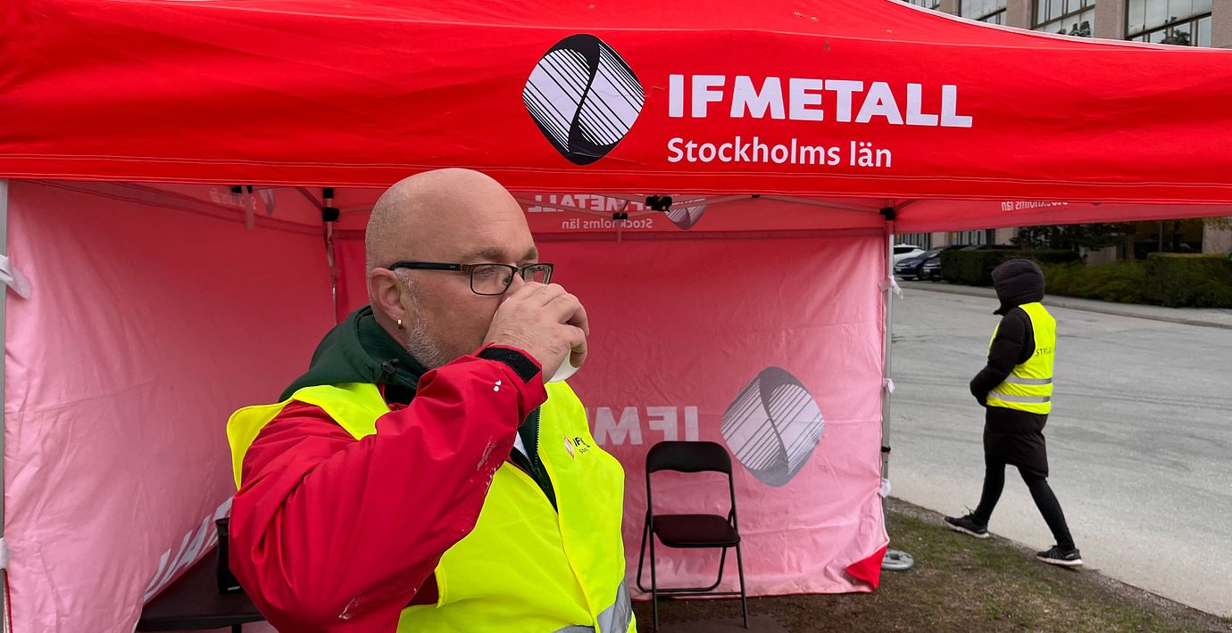 Sedan sex månader tillbaka har verkstaden blivit ännu enklare att hitta till. Ett rött informationstält har satts upp vid infarten, ett femtiotal meter från entrén. Varje vardag, under kontorstid, bemannas den av IF Metalls varselklädda strejkvakter.