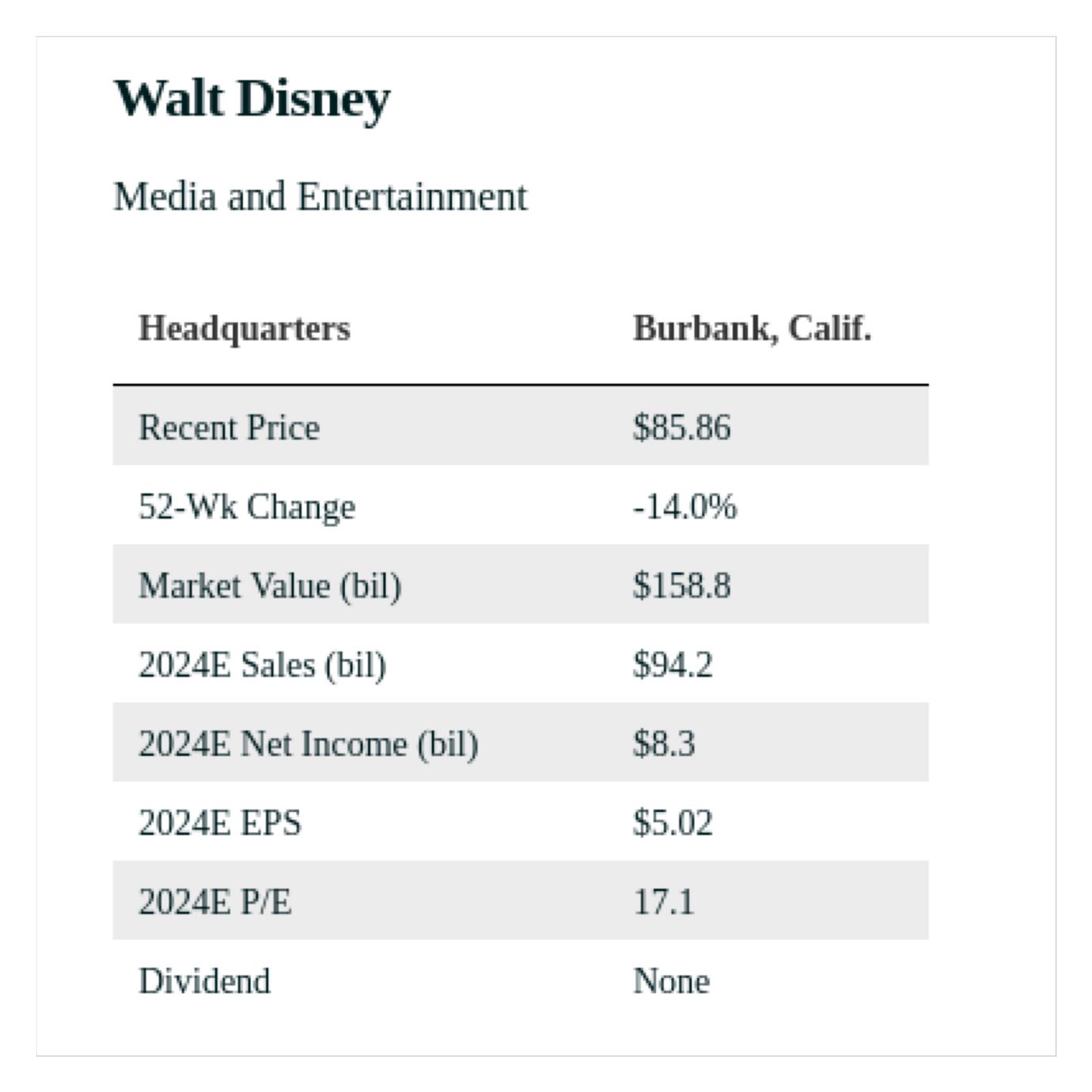 Little of the possible good news appears to be reflected in Disney’s stock price. At $85.50, near levels first hit in 2014, shares are trading at 18 times 12-month forward earnings, well below their five-year average of 29 times and below the S&P 500’s 20 times. That’s a large discount to Netflix, which trades at 30.6 times, and only a slight premium to Paramount Global (PARA), at 15.6 times, despite better prospects. Warner Bros. Discovery (WBD) trades at 196 times. Even an increase to 22 times—three quarters the historical multiple—would put Disney stock at $105, up nearly 25%.