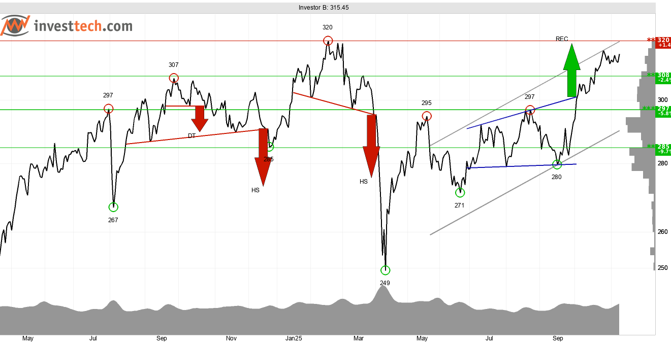 I starten av oktober i år identifierades även en köpsignal från en rektangelformation (REC). Den signalerar en fortsatt uppgång till tidigare toppnivå runt 320 kronor som även utgör en teknisk motståndsnivå. Stöd återfinns runt 308 kronor.