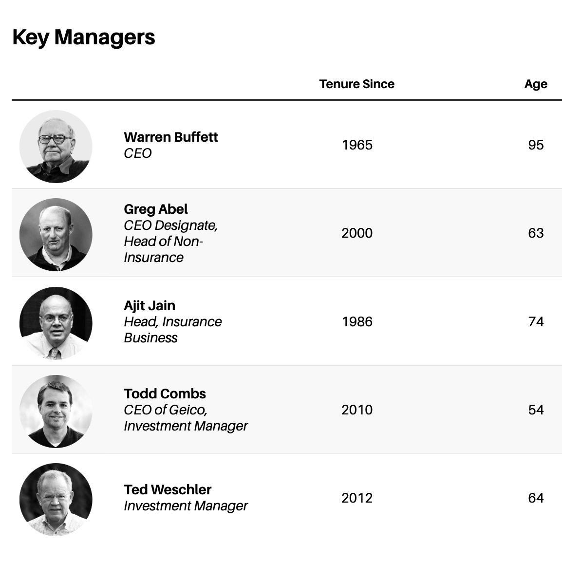 Then there are investment managers Todd Combs, 54, and Ted Weschler, 64, who now run about 10% of the $300 billion equity portfolio, with Buffett handling the rest. When they joined Berkshire more than a decade ago, Buffett said they would take it over when he stepped aside, but he later said in annual meetings that Abel should run the portfolio, raising questions about Weschler and Combs’ future role. Combs also has run Geico, Berkshire’s auto insurance unit, for six years, but that job—which was supposed to be temporary—could be nearing an end with Geico’s financial revival in the past two years.