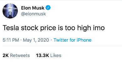 Elon Musk skriver på Twitter att han tycker att Teslas aktiekurs är för hög. Utspelet fick elbilsjättens aktie att rasa så mycket som 12 procent under fredagen.