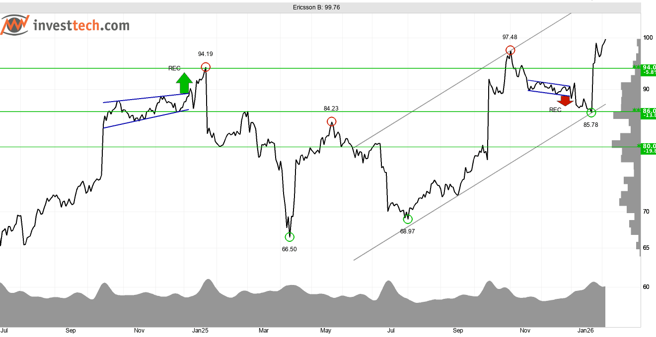 Ericsson krossar motståndsnivåer efter sin bokslutsrökare. Tele2 har också momentum när marknaden smälter årsresultatet. Båda telekomaktierna har förutsättningar att klättra vidare…