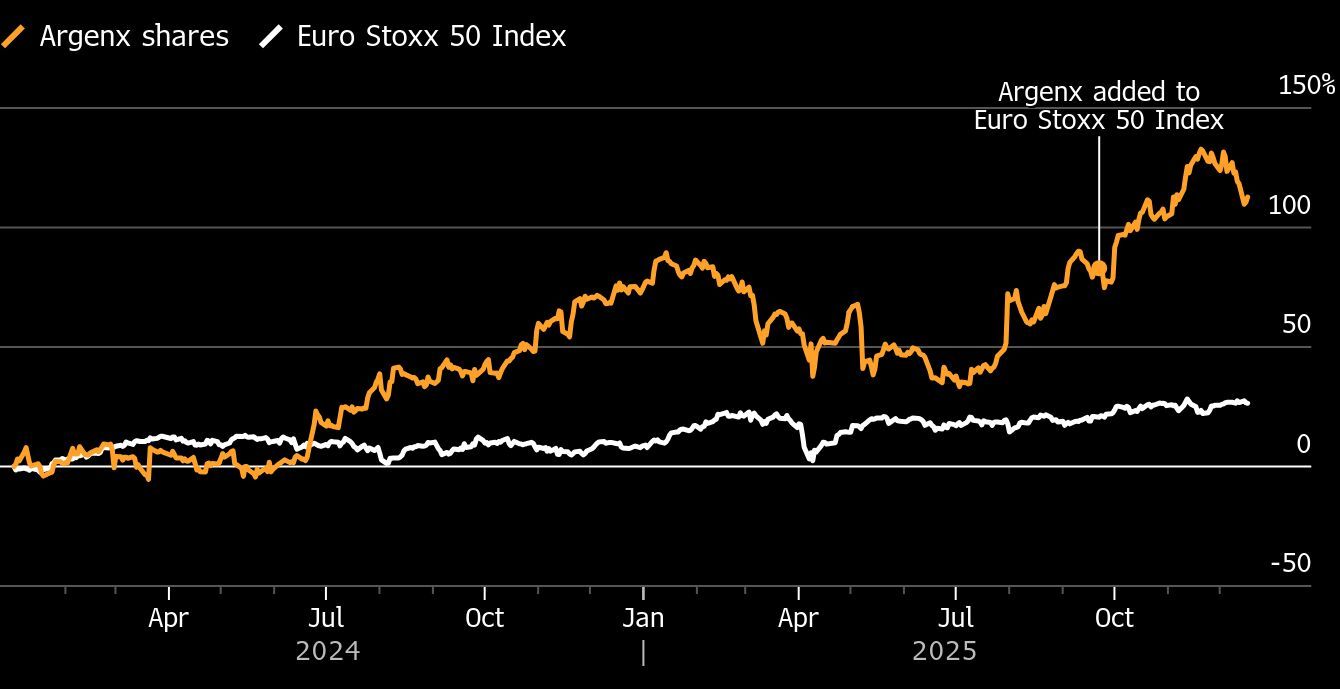 Argenx is up 24% this year and has rallied more than 8,000% since listing in Brussels in July 2014, propelling it into the euro area’s top benchmark this year. Its fortunes are closely tied to the blockbuster Vyvgart, its only drug on the market, which has been approved to treat several autoimmune diseases. Results are expected next year for four late-stage trials for further autoimmune conditions, including three for Vyvgart. The company just discontinued Phase 3 studies for Vyvgart in thyroid eye disease.